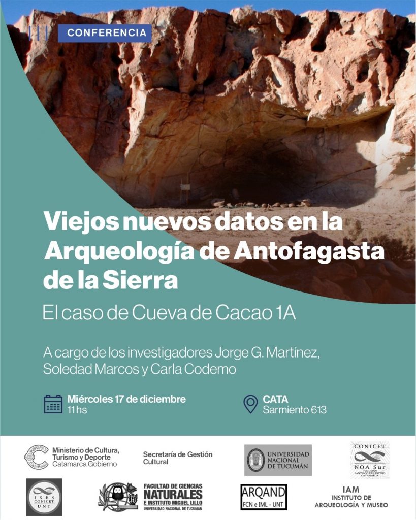 El miércoles 17 de diciembre a las 11 de la mañana, el equipo de investigadores tucumanos que trabaja en la Cueva Cacao brindará una conferencia en el Centro de Arte y Tecnología Aplicada (CATA), ubicado en Sarmiento 613. El encuentro lleva por título “Viejos nuevos datos en la Arqueología de Antofagasta de la Sierra: el caso de Cueva Cacao 1.A” y está dirigido a todo público interesado.