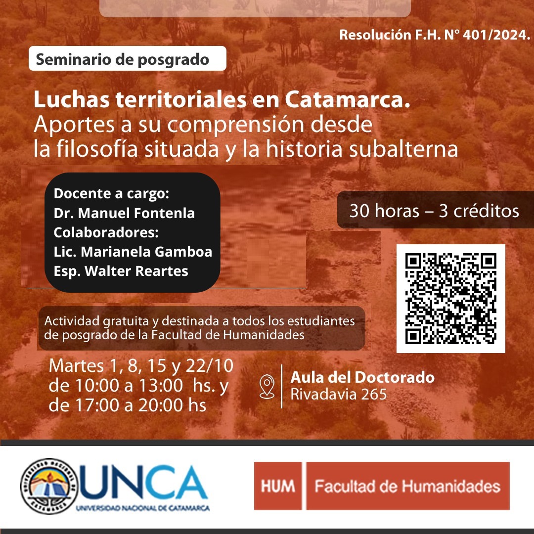 Nos complace invitarlos a cursar el Seminario de Posgrado "Luchas territoriales en Catamarca. Aportes a su comprensión desde la filosofía situada y la historia subalterna", a cargo del equipo docente integrado por el Dr. Manuel Fontenla, la Lic. Marianela Gamboa y el Esp. Walter Reartes.